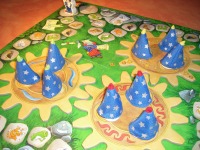 Когда будете накрывать волшебными шляпами фишки с животными, обратите внимание, что на каждой шестеренке должны присутствовать шляпы с верхушечками разных цветов, т.е. на одном зубчатом колесе должны быть шляпы с красным, желтым и зеленым верхом.