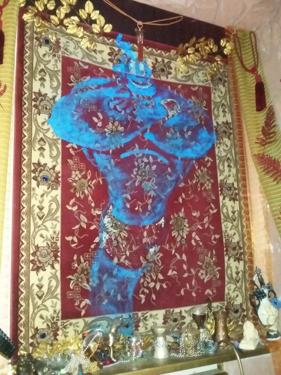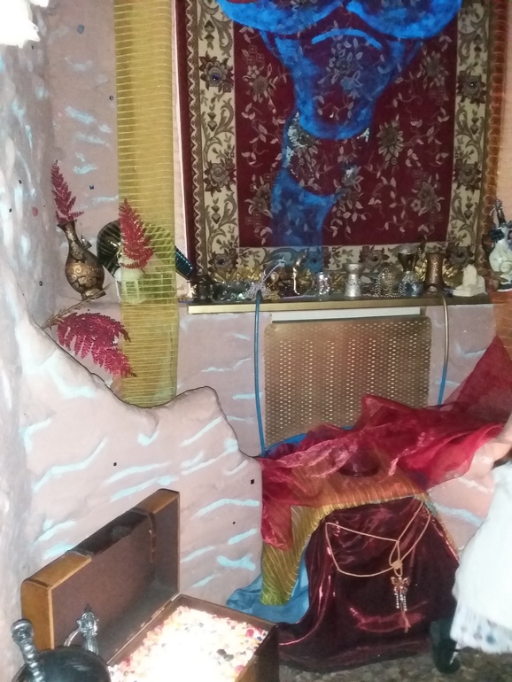 Из ларца с сокровищами выбрали все голубые кристаллы и выложили на крышке облако. Тогда на ковре появился (с ультрафиолетовой подсветкой) Джинн (а у меня он от вспышки проявился):
