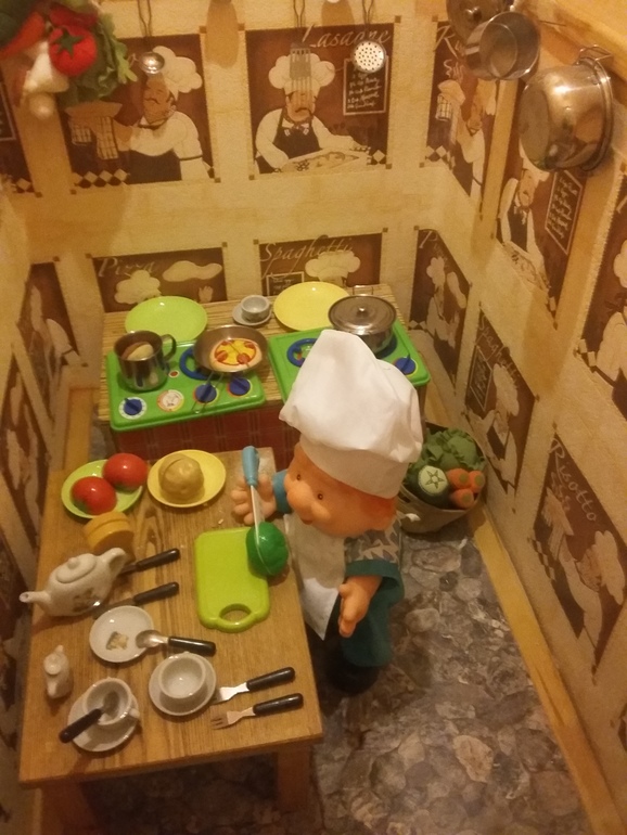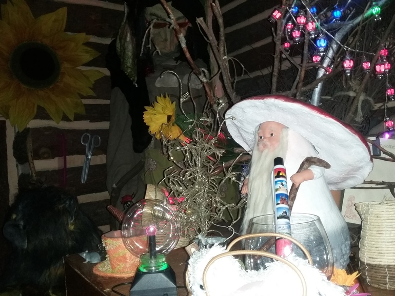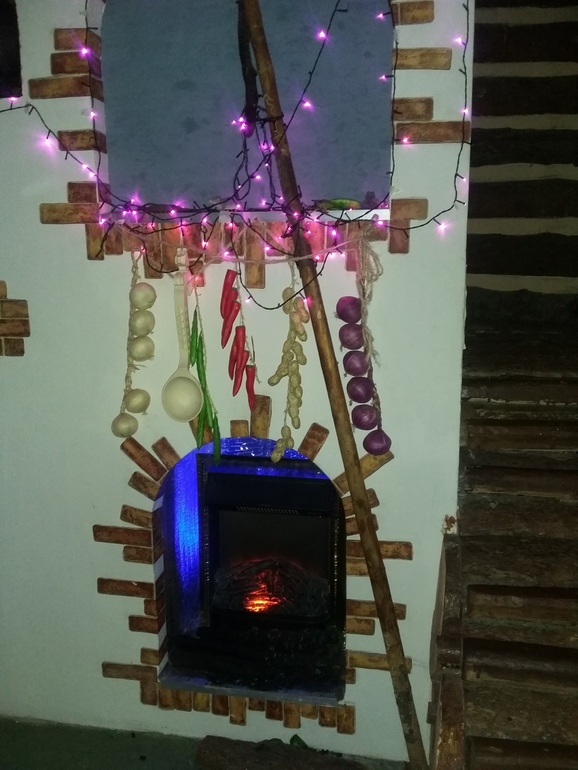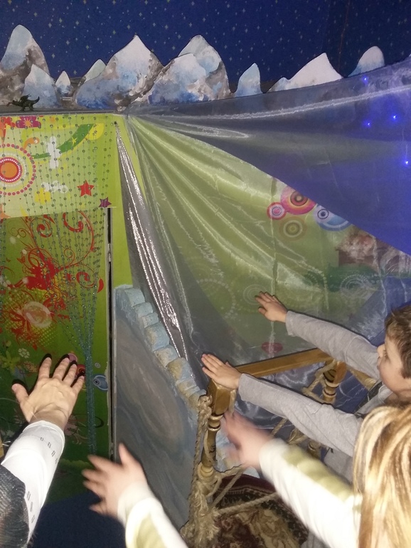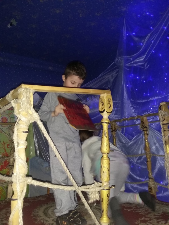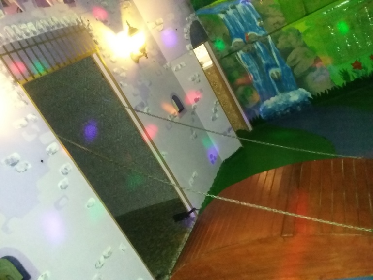 Все игровые пространства - в темноте. Подсветка - гирлянды,или как тут - огонь в печи. Очень темно, фотки все смазанные.
