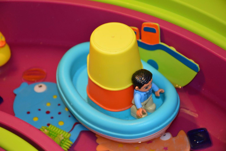 пересыпать кукурузную крупу в пруд, грузовичок и стаканчики в столе;