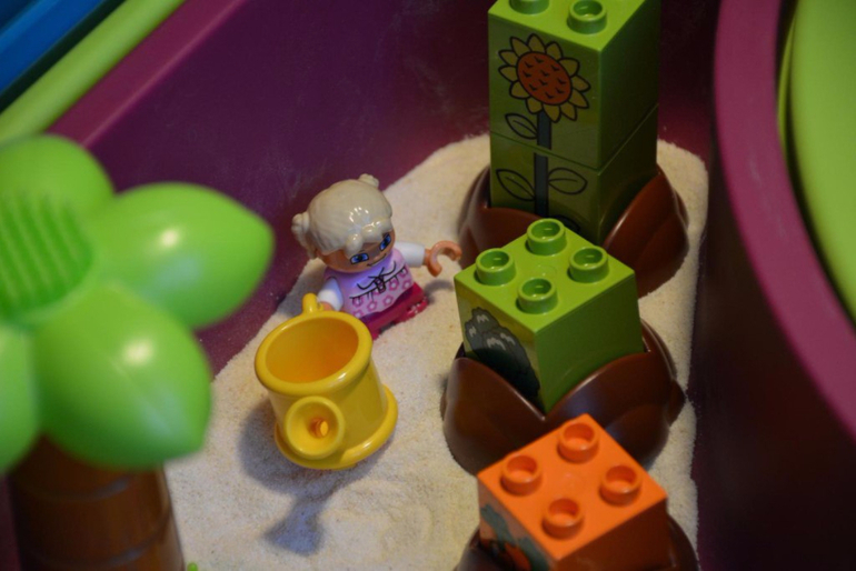 огород, детская песочница, лужайка с насекомыми и ежиком;