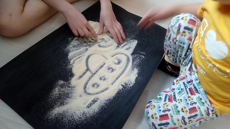 Я высыпаю манку на противень. Он чёрный, гладкий, поэтому удобно рисовать. И с бортиками, поэтому ничего не просыпается.