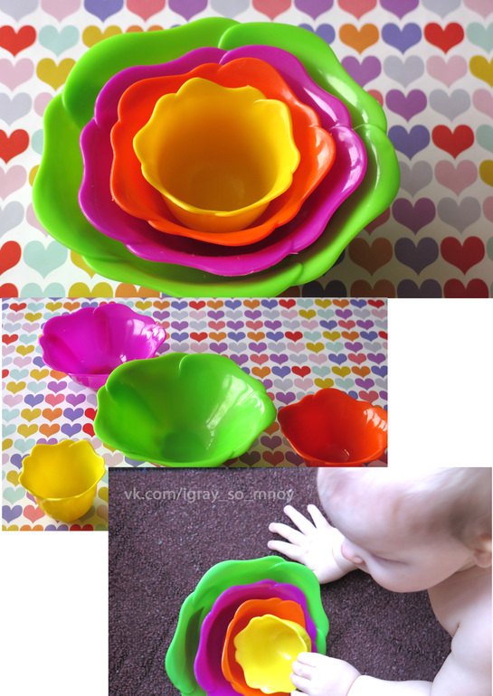 Прекрасная замена детских стаканчиков для игры по принципу матрешки. Яркие цвета, необычная форма. Подойдет для пересыпаний, для изучение понятий "больше" - "меньше" - "средний".