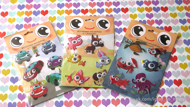 Было 3 серии: домашние животные, морские, и автомобили. Глазки приклеены косенько, но это придает наклеечкам забавный ошалелый вид. Можно использовать для наклеивания саму подложку, она с двух сторон с фоновой картинкой. А можно нарисовать для машинок гаражи по цветам, домашним животным соответствующие домики (собаке - будку, лошадке - конюшню...). Морских животных можно приклеить на голубой фон и, вырезав водоросли из зеленой бумаги, предложить ребенку спрятать за ними животных.