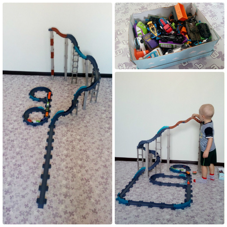 Гоняют машинки и паровозики по железной дороге Чаггинтон. Машинки Hot Wheels отлично помещаются в колею и "летают" лучше и дальше, чем грузные паровозики.