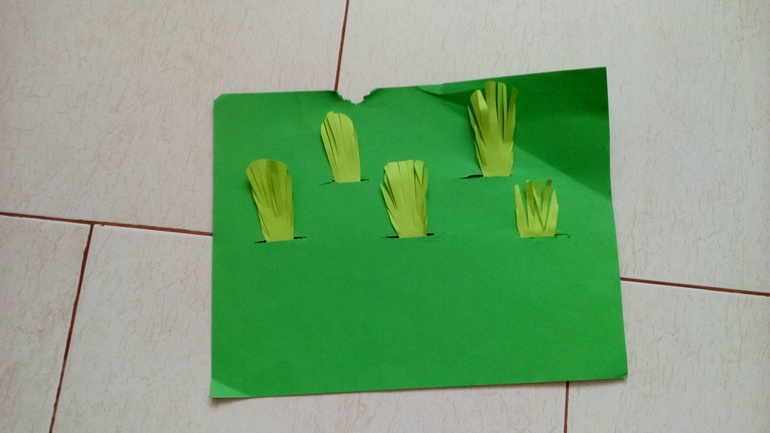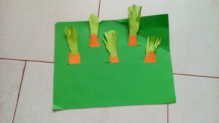 Все сделано буквально за 5 минут: прорези в листе бумаги, вырезать и приклеить детали морковок и все - готово!