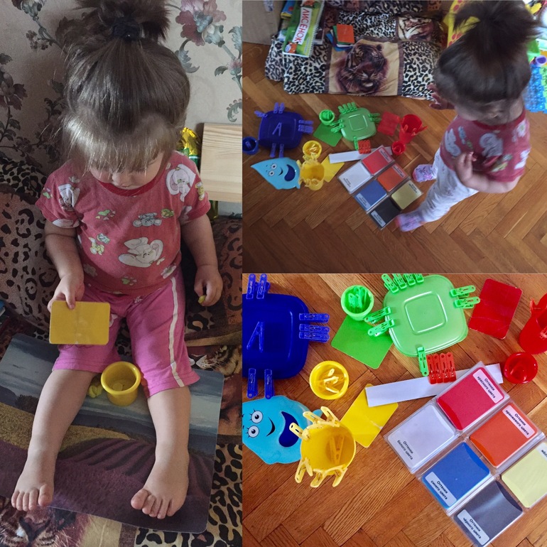 Играем в прищепки.Цепляем на предметы такого же цвета:пластиковые стаканчики,крышки от контейнеров.Смотрим какие цвета из творчества подходят,например крышка,которую все бы назвали зеленой,на самом деле травяного цвета.