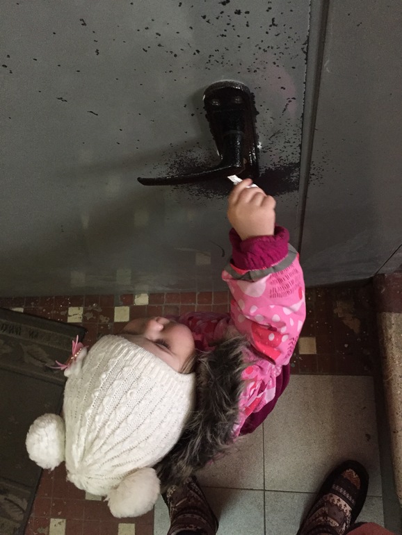Пробуем открыть дверной замок ключом.Пыхтит,кряхтит и пытается вставить ключ.Пока не выходить,но попытки-это уже полдела.