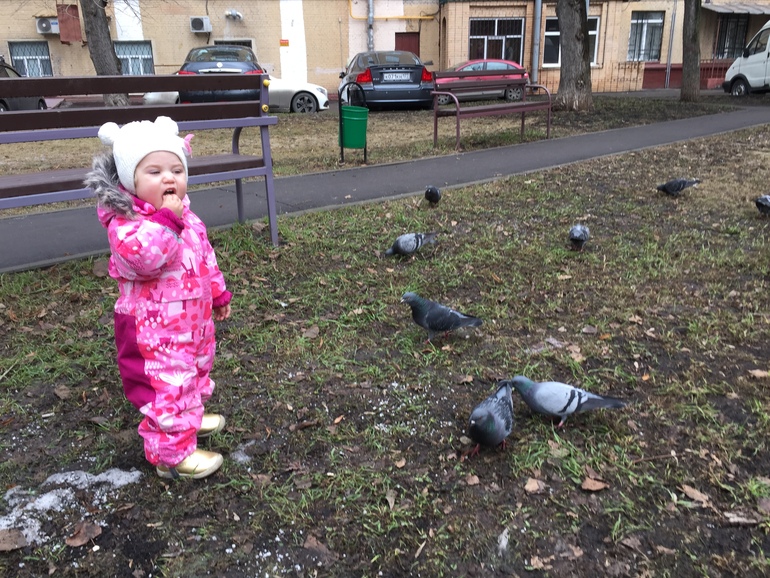 Смотрим на голубей и кормим их,себя Аня тоже не забывает покормить☺