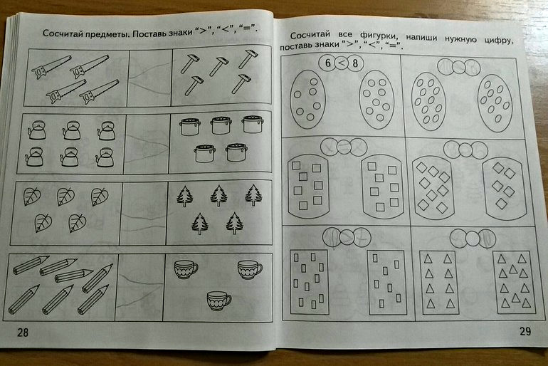 Дочка эти понятия освоила быстро и уверенной рукой расставляла знаки < > и =. Она сразу запомнила, что где широкий край там больше, где узкий - там меньше. После такого количества упражнений это доведено уже до автоматизма.