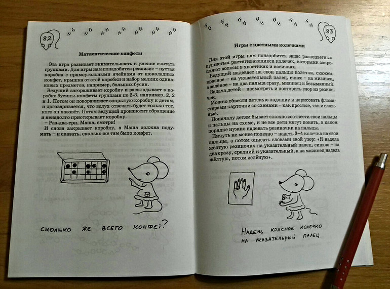 Очень хвалят эту тетрадку логических заданий от Жени Кац. Пожалуй, я присоединюсь к этим отзывам. Но будьте внимательны, здесь нет примеров, да и цифры нужно писать только в нескольких заданиях. Зато это целый кладезь для развития мышления.Некоторые упражнения я нигде раньше не встречала. Например, разделить на детали домино или определить по ушам, сколько кроликов спряталось за забором. А над заданиями с палочками, когда нужно определить какую деталь переложили или убрали дочка изрядно поломала голову. Сначала строила фигуры из карандашей, перекладывала, сверяла, а к концу тетради уже на глаз все определяла.
