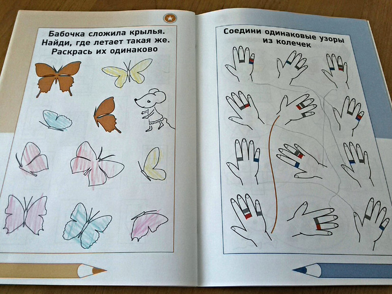 Сборник толстый, целых 80 страниц. Тематика заданий очень разная, периодически она повторяется в немного измененном виде. Если раньше мы соединяла по цветам руки с кольцами, то теперь подбираем кубикам подходящие домики.