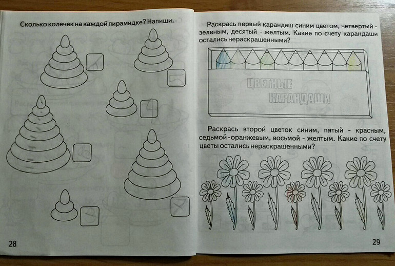 Также есть задания на порядковый счет, когда нужно дописать пропущенные числа или написать цифры, соотнося их с величиной слоника от самого большого до самого маленького. На мой взгляд, в функцией счета тетрадка справляется хорошо.