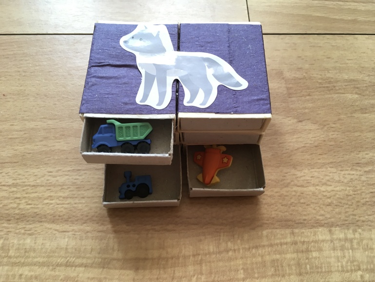 2) "Комодик" из спичечных коробков 6 штук (прототип мнемотехнических таблиц), прячу игрушку, через какое-то время спрашиваю, где? постепенно увеличиваю количество коробков и игрушек;