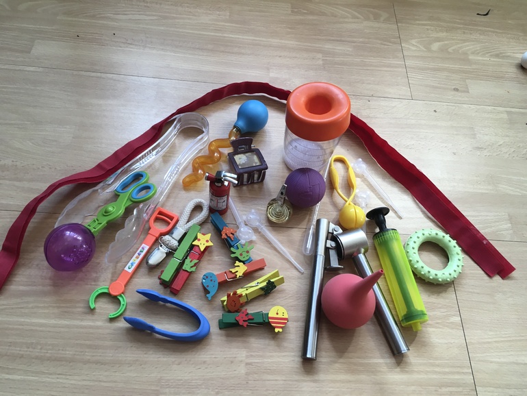 1) кнопки, шпильки, гвоздики, зубочистки, экспандер, клизмы, прищепки, заколки-крокодилы, пипетки, щипцы, хваталки, чеснокодавилка, соковыжималка для цитрусовых, дырокол, степлер, липучки, насос ( для воздушных шариков, разумеется))) и все прочее, чем можно давить, отжимать, протыкать, вкручивать и вбивать, вообщем, прикладывать усилия - способствующие укреплению кистевых и пальчиковых мышц.