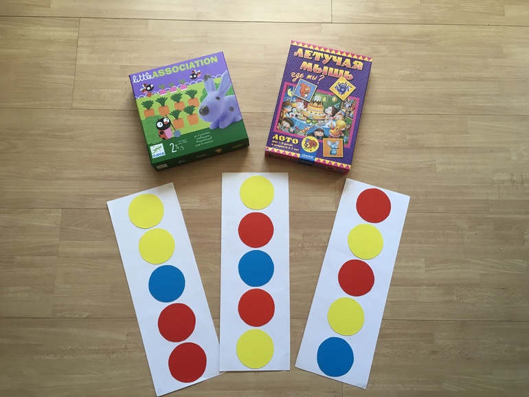 Вот ещё открыли для себя три отличные игры на внимание. Первое почти переросли, второе трудноватое, а светофорчики - самодельные. К ним нужны такие же пары кружков, после недолгого разглядывания ребёнок должен повторить комбинацию. Это аналог никитинского Внимания, только для малышей. Но это ближе к 3-4 годам.