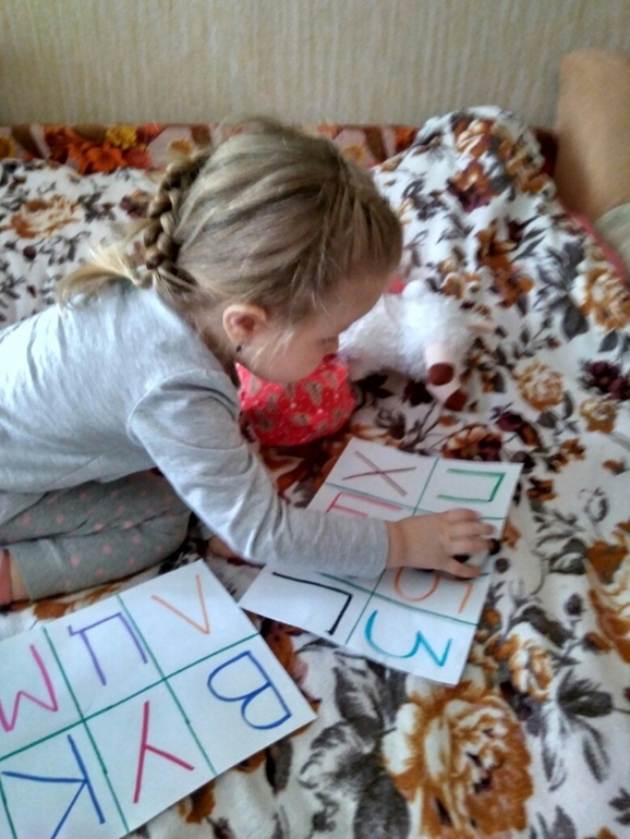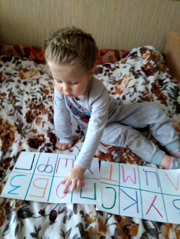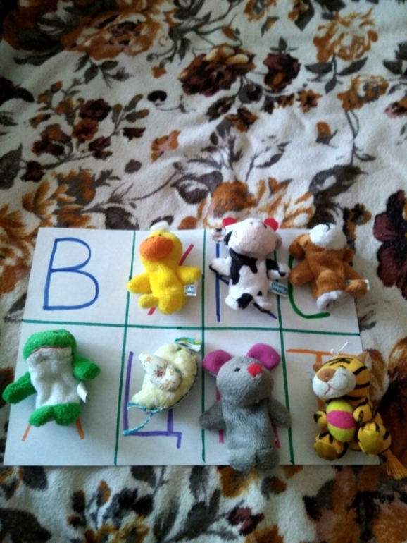 Ребенок вытаскивает из «секретного мешочка» разные игрушки (у нас пальчиковые куклы из комплекта , игрушки-эмоции из , маленькие плюшевые зверушки и парочка глиняных овощей-фруктов) тем самым преодолевая страх неизвестности и конечно же воспринимая каждый предмет тактильно. Еще есть поле с буквами, по которым нужно распределить все предметы из мешочка, а если сделать буквы цветными, то можно и цвета повторить. Т.о игра становится очень увлекательной и полезной! Вроде все просто, а играли с интересом и большим удовольствием. Если не забывать подогревать интерес эмоциональными восклицаниями типа «А кто еще прячется в нашем мешочке?» и хвалить малыша, то успех такой развивашке обеспечен) Вот так мы повторили сегодня буквы и забавно провели время. Рекомендую!