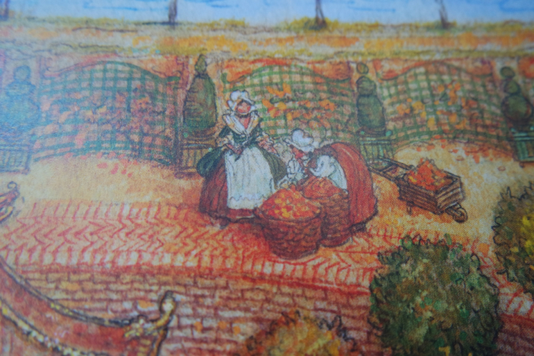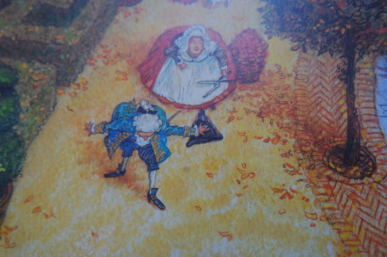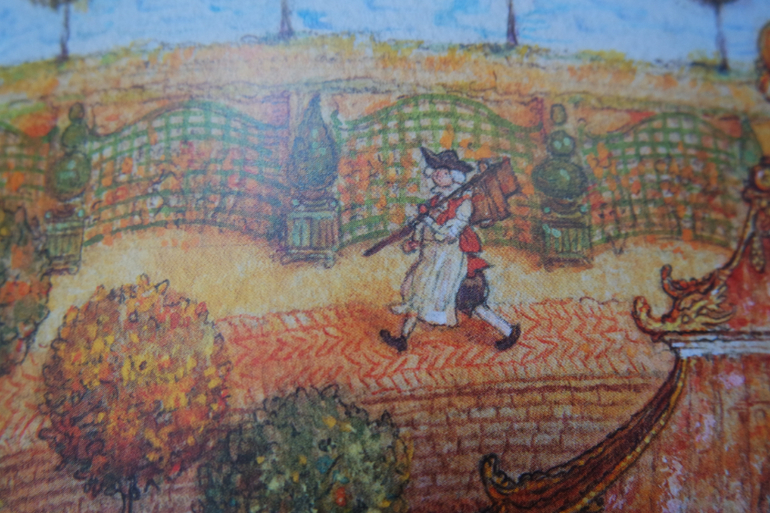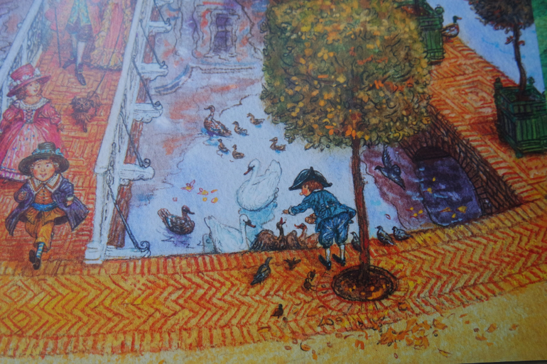 Верный пес? Нет, я вам показываю красивую скатерть!Детали везде: свет из окон дворца, кто-то читал книгу в беседке...