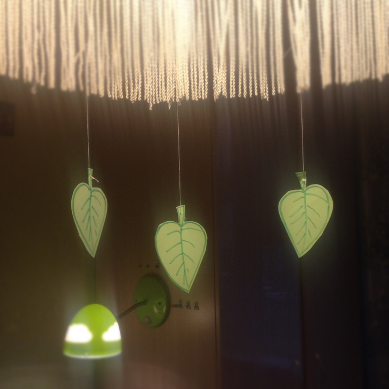 Теперь наступила очередь ветра. Вырезали листики, привязали их на нитки и стали дуть, пока все не оторвали))