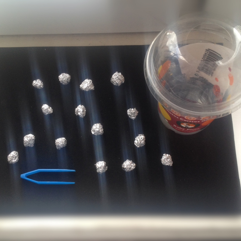 Немного мелкой моторики, заодно рассказала про метеоритный дождь. Скатали шарики из фольги. Это метеориты. И пинцетом собирали наши метеориты в баночку.