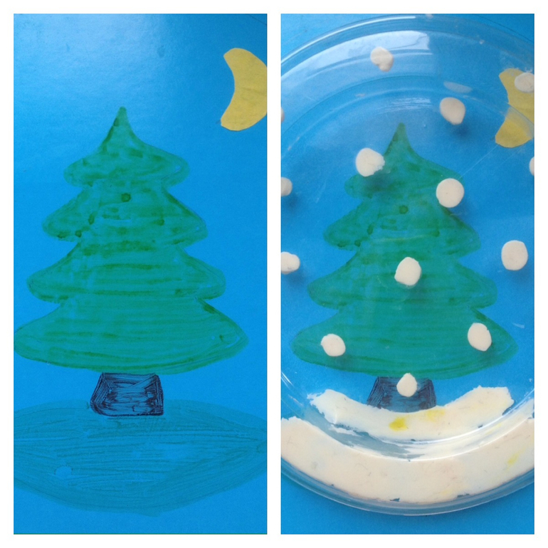 На прозрачной крышке пластилином сделали снежинки. На бумаге нарисовали елку. И накрывали ее крышкой, получается елка то летом, то зимой.