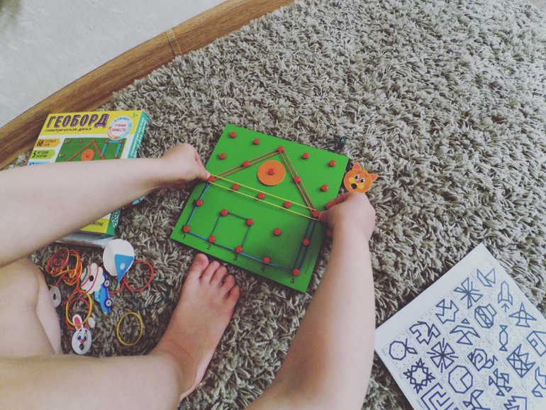 Новый хит сезона _ геоборд) интересная штука,маленького курощателя домомучительниц занимает надолго, к тому же очень пользительна для развития мелкой моторики ,пространственного воображения ,ну и мозгов в целом.В коробочке с игрой идет сам ,собственно,геоборд,схемы с картинками,буквами,инструкцией для родителя ,цветные резиночки и несколько картинок с дыркой по середине для самостоятельно выдуманных игр. Рекомендованный возраст 3+,Тимону прокатила б и раньше,жаль я о такой замечательной штуке узнала только недавно