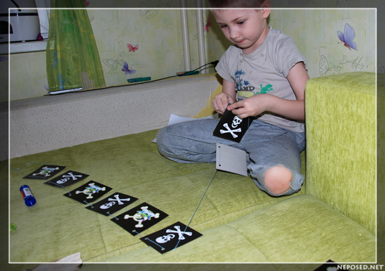 6. Пятая загадка про диван. Задание - собрать на ниточку гирлянду из флажков. Вешаем её тоже на наш корабль.