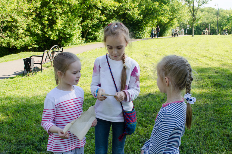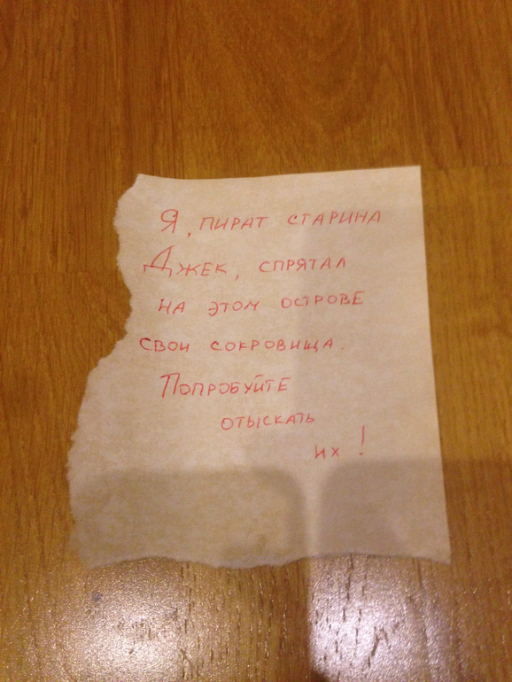 В траве у пруда дети нашли карту (с оторванным углом) в бутылке и записку с загадкой. Обмануть детей, что писал действительно пират не удалось, т.к. Алёна сразу начала кричать: "Это моя мама!!!! Девчонки, будет круто!"