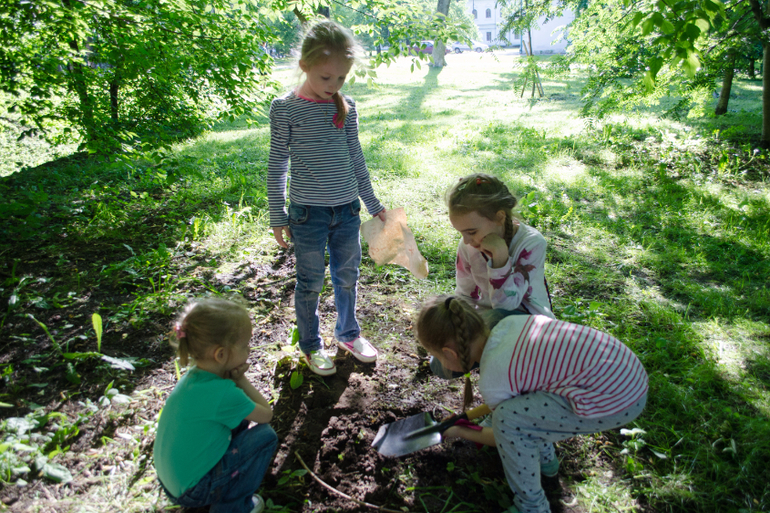 У ворот в кустах нашли лопату и записку с микротекстом "идите к подземелью". Тут и пригодилась лупа. Где подземелье дети не особо знали, кидались копать у канализации и любых ям :)))) пришлось подсказать, куда идти, а место копания указывала веточка с повязанной на ней лентой.