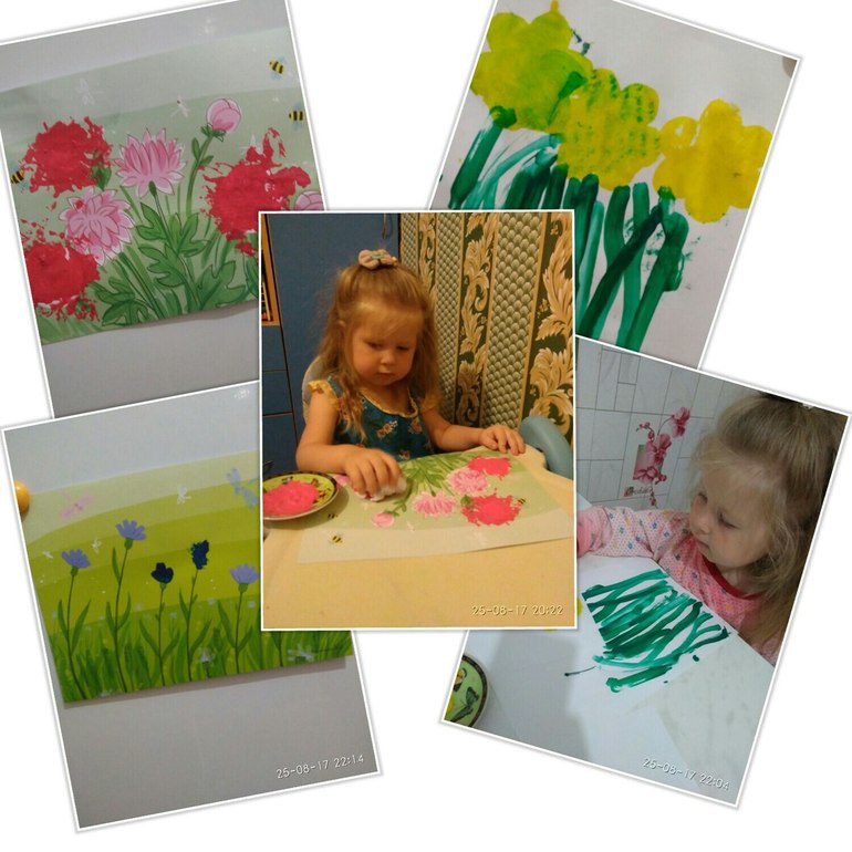 Создавали свои шедевры на листах и один букетик Слава сама нарисовала на чистом листе (любимая техника рисования с помощью трафаретов).