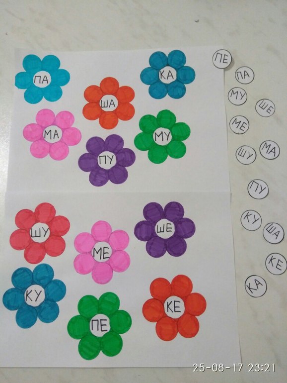 Последний блок - чтение. Повторяли слоги, которые Слава уже освоила с помощью кубиков «Читаю легко» (про наши занятия по кубикам напишу отдельный пост. Скажу только одно: я под впечатлением!!!). Нужно было прочитать слог, найти подходящий цветок с таким же слогом и поместить серединку на место.