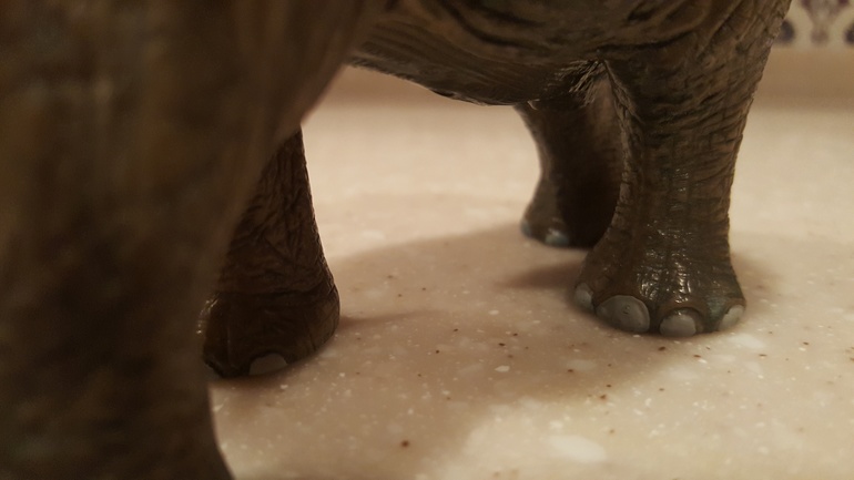 На ступнях нашего слона 5 копыт на передних и 4 на задних (у африканского 5 и 3):