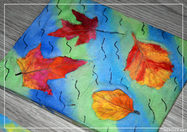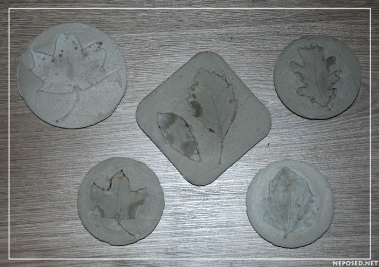 В разные крышечки, у меня это от сметаны, сыра феты, кладём ровным слоем плиточный клей, ну а в идеале глину ) и немного вдавливаем осенние листочки, чтобы остались прожилки. Оставляем высыхать.