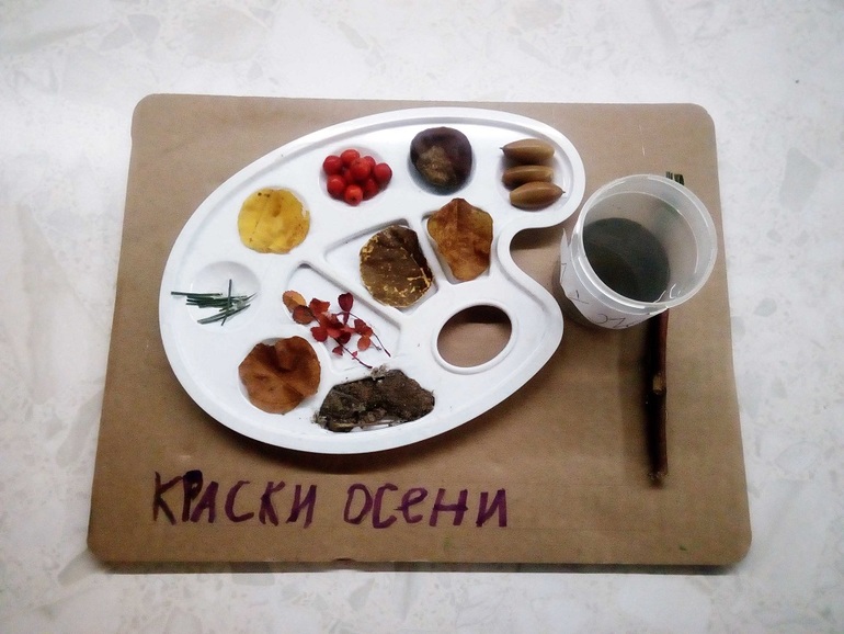 На клеевой пистолет отлично приклеились листья, каштаны, желуди, трава, рябина и даже земля.Кисточка - это палка с травой вместо щетины. В стакане лужа. Для недогадливых подписано)