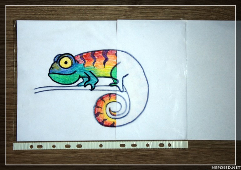 Сверху раскрашенного хамелеона кладём в файл ещё один чистый лист бумаги. Когда чистый лист в файле, то хамелеон спрятался - он такой же белый как лист, а когда мы чистый лист вынимаем - хамелеон нашёлся.