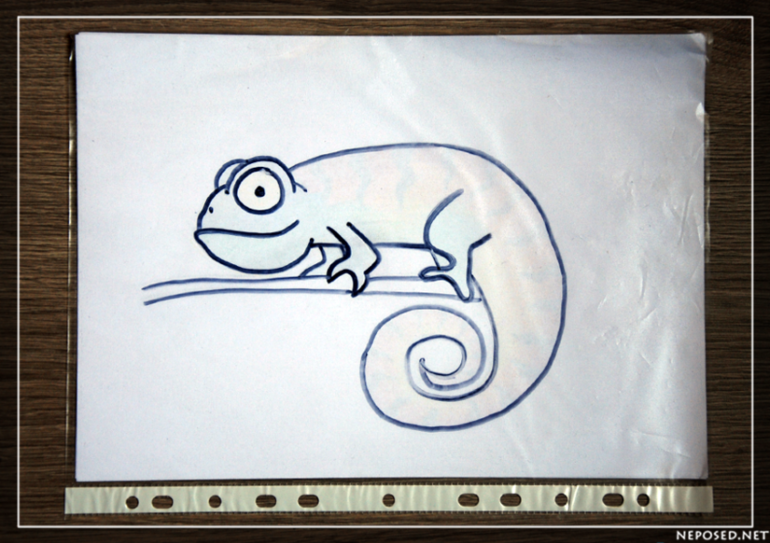 Для этого сделали вот такую забаву. На листе бумаги рисуем хамелеона. Затем лист бумаги кладём в файл и маркером обводим на нём хамелеона. Потом достаём лист бумаги и раскрашиваем хамелеона.