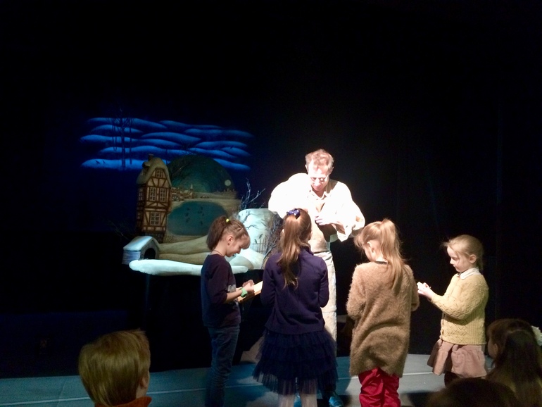 Это моно-спектакль одного актера (если о людях) и очень симпатичное и душевное действие (если о героях). Идёт спектакль минут 40, без антракта. Помещение маленькое, видно всем прекрасно, дети на первых двух рядах сидят.