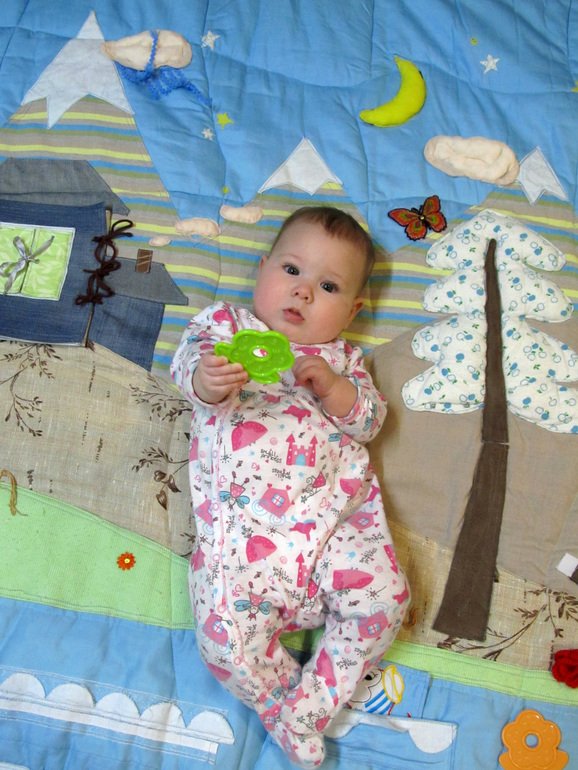 • Пальчиковые игры у нас так и не пошли, ни у Ксюши, ни у Кати. Так что все выкручиваемся как можем, например, быстро «щиплем» пальчики, прячем в кулачок. Даем потрогать предметы с разной фактурой и свойствами. Перебираем бусы, браслеты, тесемки, лоскутки, пакеты, фантики (под чутким присмотром, конечно). Даем помять фольгу, бумагу (реакция на фольгу у Ксюши была просто огонь!)