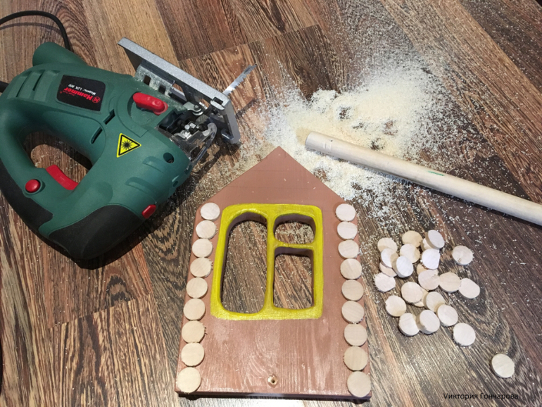 Для эффекта бревен распилили палку, отшлифовали, покрасили и приклеили брусочки к домику.