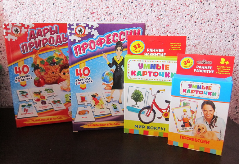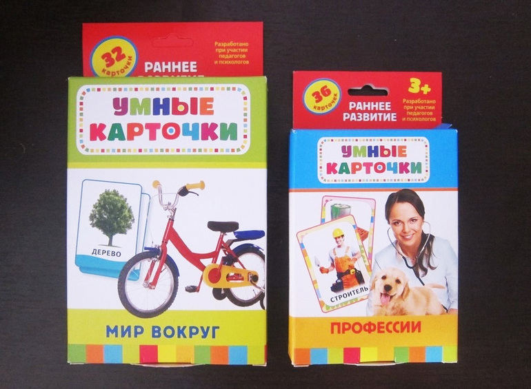 После успеха игры "Профессии" я поняла, что надо расширять границы мировозрения ребенка. 8 профессий для него уже маловато. И тогда мой блуждающий взгляд остановился на "Умных карточках" от "Росмэн". В серии два вида карточек, отличающихся размерами и подачей информации.