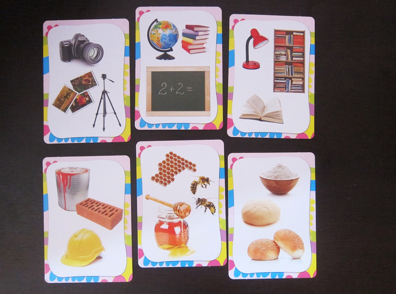 2. Игра "Выбирай!". Выкладываем в ряд 4 карточки изображением предметов вверх. Первый игрок выбирает себе карточку. Выбрать - это значит назвать профессию. А чтобы карточку получить необходимо назвать все предметы, которые на ней изображены.