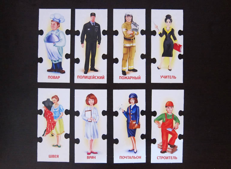 В игре 8 профессий. К каждой надо подобрать 4 карточки. Обратите внимание, что замочки на всех карточках одинаковые. Поэтому подобрать картинку по типу замочка не получится, а значит думаем, а не хитрим.