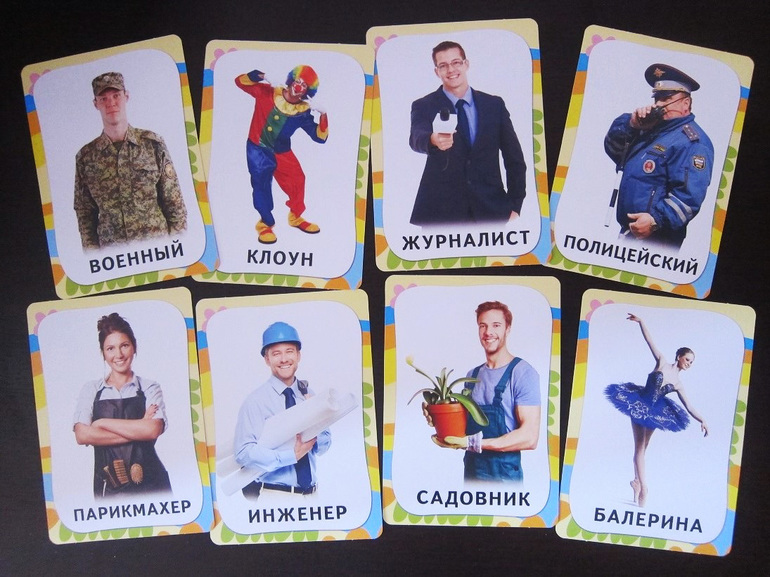 В наборе "Профессии" 34 двусторонние карточки с профессиями и 2 карточки с правилами игр (4 игры).