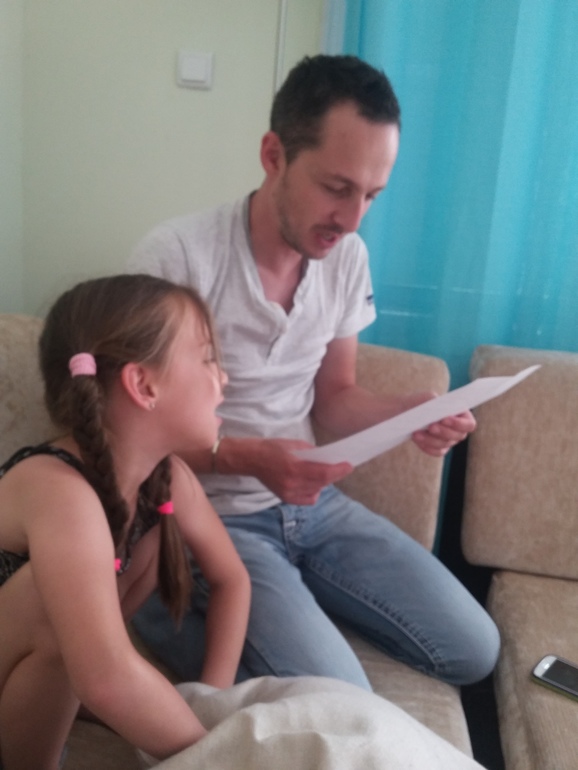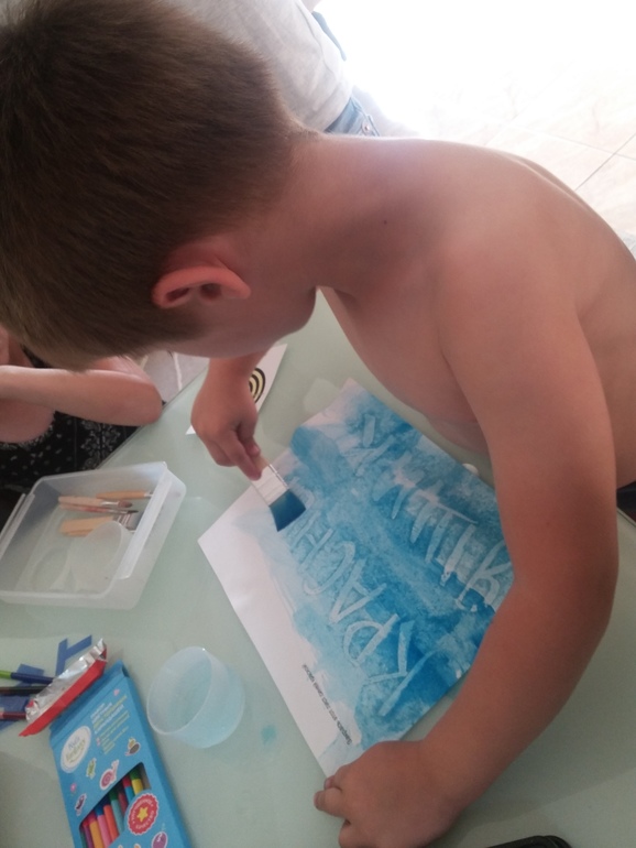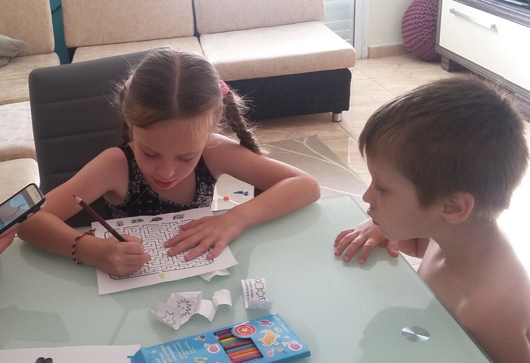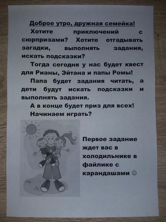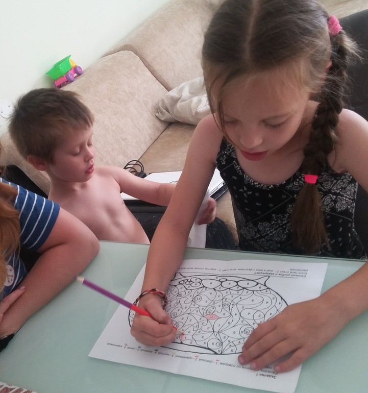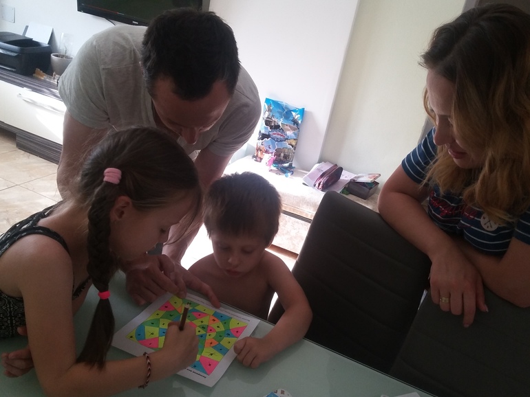 В холодильнике лежал файл с заданием и карандашами (тоже привезла из России). Папе пришлось поднапрячься и прочитать что каким цветом раскрашивать: