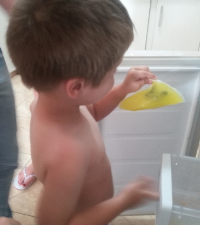 Посчитав рыбок полетели к вазе, где между фруктами ждал маленький листочек с загадкой про стиральную машину. Прибежали к ней, а она забита шариками. Лопали с огромным удовольствием: