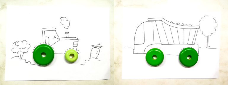• Дополняем рисунки недостающими деталями. Например, подбираем колеса машинам.
