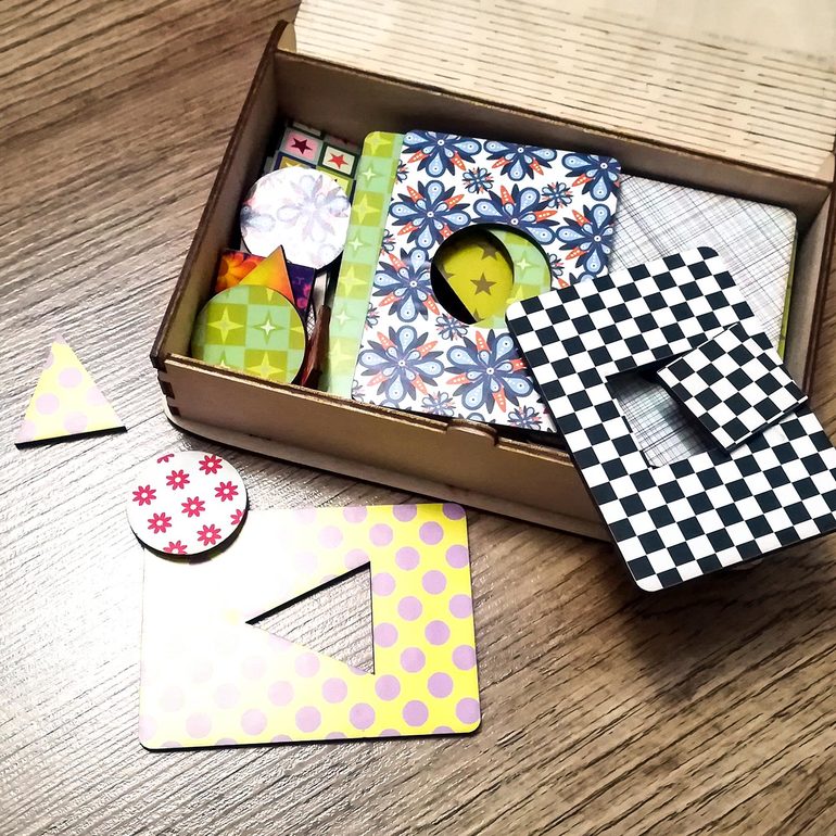• Заплатки (например, досочки Сегена) - карточки с прорезями в виде геометрических фигур. Задача: подобрать «заплатку» к этим прорезям. Пока выдаю одну-две карточки и мы пробуем правильно вставлять «заплатки» (как рамка-вкладыш).