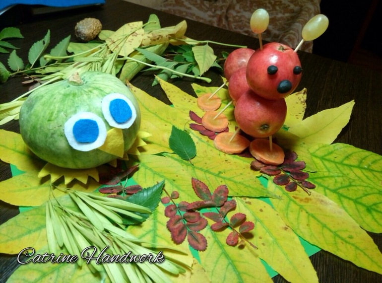 1. Поделка в детский сад. Сын сам: собирал яблоки в саду у бабули и тянул морковку с грядки, как репку; собирал листья; приклеивал листья к картонной основе, нанизывал виноград на зубочистки; с удовольствием хрустел фруктами)))