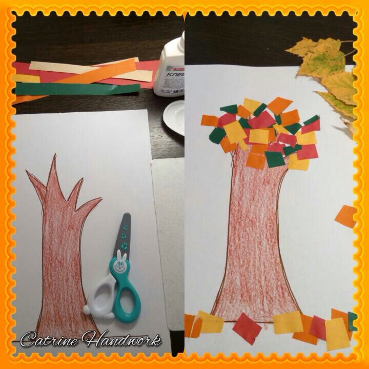 Листья сын вырезал из цветных полосок. Работа трудоемкая, поэтому можно разделить на два этапа (два дня один выраем, другой- клеим).