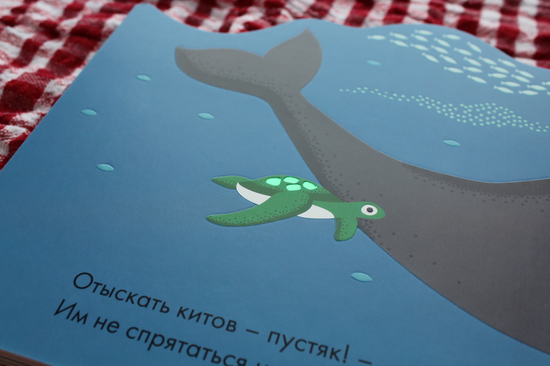 Думаю, суть ясна. Кроме того, что с говорящими детьми уже можно играть в угадайки, а с неговорящими - просто удивляться появлению новых персонажей, здесь еще и сокрыт сенсорный элемент. Главный персонаж блестит. В этой книге - переливчатый черепашонок присутствует на каждом развороте. Сложно передать через фото, но как-то вот так: